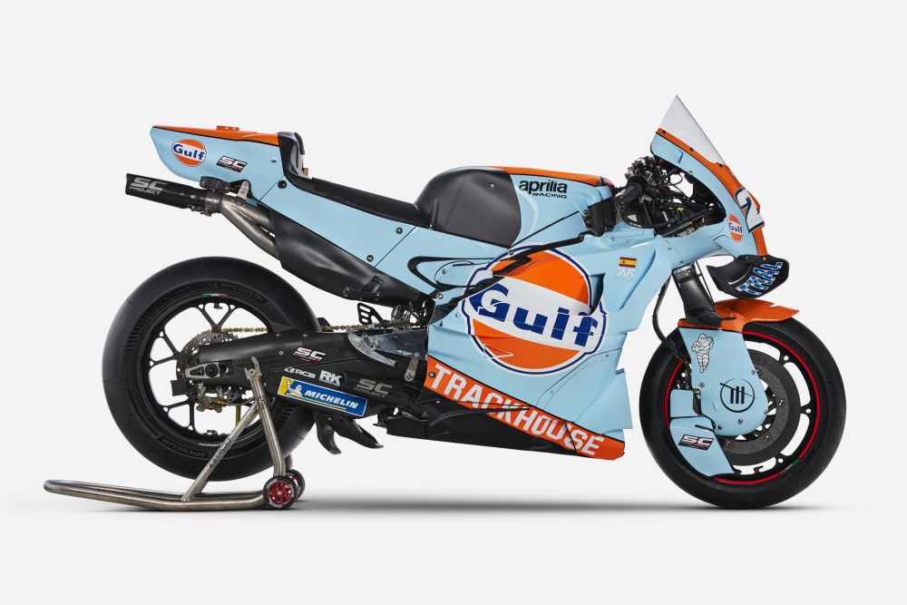 Para celebrar esse momento histórico, a equipe norte-americana terá suas Aprilia RS-GP nas pistas com o tradicional esquema de cores azul e laranja da Gulf. Combinando azul celeste e laranja, ela surgiu no final dos anos 1960, e ganhou fama ao estampar máquinas como Ford GT40 e Porsche 917 em inúmeras edições das 24 Horas de Le Mans.