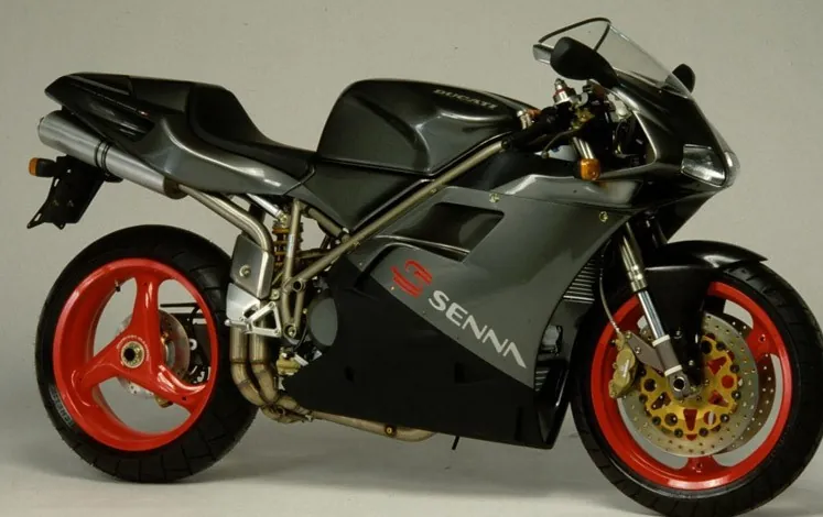 Ducati 916 Senna: a máquina italiana foi fabricada até 1997, teve tiragem limitada a apenas 301 unidades e é fruto de colaboração entre o tricampeão da F1 e a casa de Borgo Panigale. O piloto brasileiro sugeriu a adoção de peças em fibra de carbono para deixar a moto mais leve, além da pintura em cinza escuro para dar destaque as chamativas rodas em cor de abóbora. Para movê-la, a missão fica a cargo do motor L2 de 916 cm³ com quatro válvulas por cilindro e 115 cv de potência máxima.