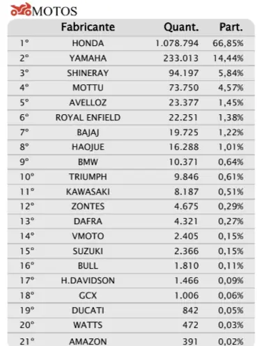 Na participação por marcas, a Honda segue soberana com 66,85% do mercado, totalizando 1.078.794 motos vendidas entre janeiro e setembro. A Yamaha ocupa o segundo lugar, com 14,44% de market share (233.013 unidades), enquanto a Shineray fecha o top 3 com 5,84% de participação e 94.197 motocicletas comercializadas.