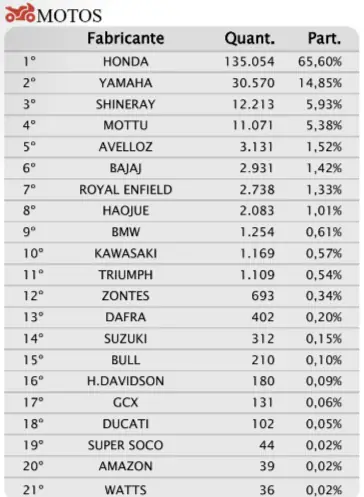 Honda mantém liderança, Yamaha e Shineray completam o pódio
