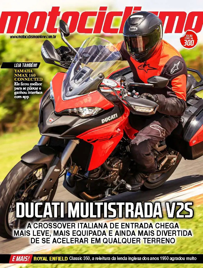 Isso posto, vamos falar do cardápio de motos presentes na MOTOCICLISMO 300. Uma delas é a Ducati Multistrada V2S, a “multimoto” da casa de Borgo Panigale que está mais leve, baixa e fácil de pilotar. Quem também marca presença nas páginas da MOTOCICLISMO 300 é a Royal Enfield Classic 350, nova geração da clássica da marca indiana que esbanja competência e estilo, principalmente para quem busca uma moto para passear por ai com tranquilidade e elegância.