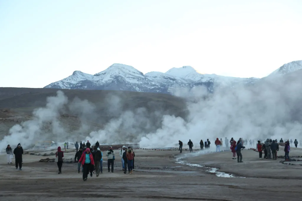 Madrugamos para visitar os geisêres de El Tatio, que ficam a 80 quilômetros de San Pedro. A atividade vulcânica acontece ao amanhecer com temperaturas negativas, então, optamos por um tour de van com um guia local. O café da manhã é feito lá, no meio do nada, junto aos vapores que brotam do chão.