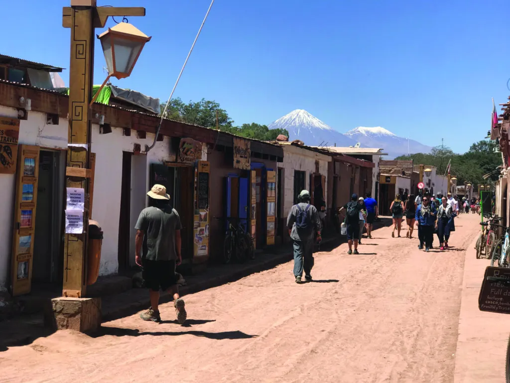 O vulcão Licancabur marca a chegada a San Pedro. Na parada para fotos todos comemoram a chegada ao destino, cujo pico nevado será visto no horizonte em toda a expedição. A cidade tem farta opção de gastronomia, de petiscos e “una cerveza” a menus elaborados.
