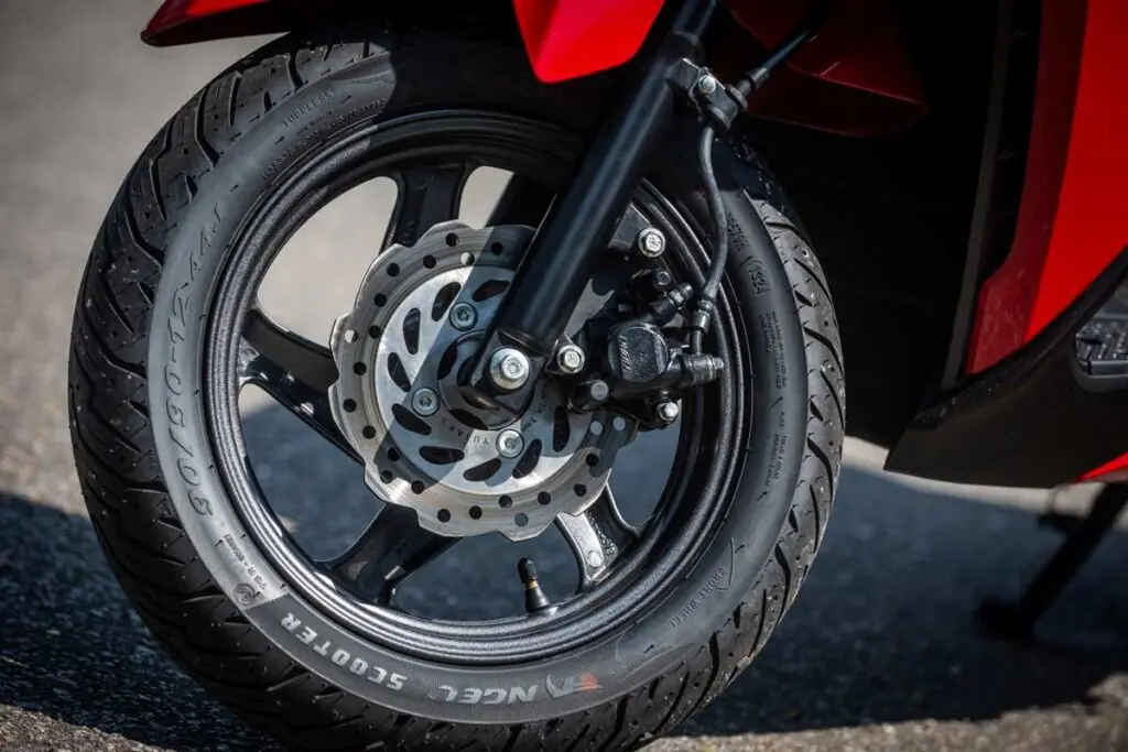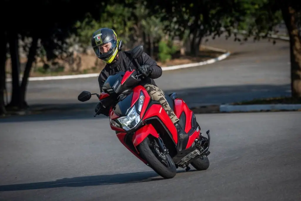 A distância entre-eixos e altura em relação ao solo também aumentaram na comparação com o anterior, contribuindo na estabilidade e na transposição de obstáculos. As rodas permanecem com aro de 12 polegadas na dianteira e 10 na traseira, por isso ainda é preciso ter cuidado com buracos mais fundos, corriqueiros nas grandes cidades, mas agora calçam os pneus Pirelli Angel Scooter nas medidas 90/90-12 e 100/90-10 respectivamente, macios, de boa aderência e um desenho que promete bom desempenho em piso molhado.