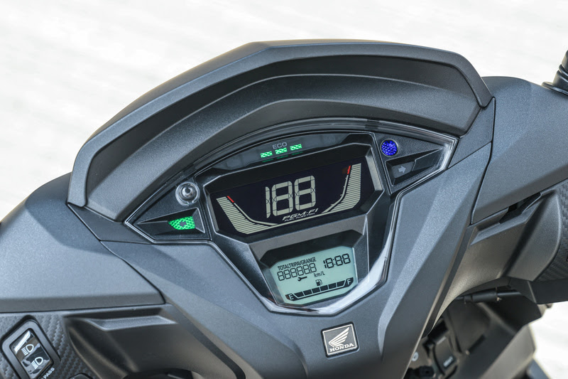 O pacote de equipamentos do Honda Elite 125 2027 ainda inclui painel LCD blackout com velocímetro, marcador de combustível, hodômetro, voltímetro, relógio, indicador ECO e dados de consumo parcial, total e autonomia.