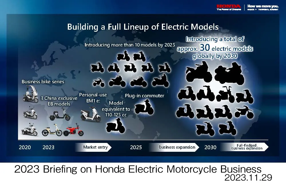A fabricante pretende acelerar seus esforços, prometendo ter 30 modelos elétricos em seu line-up até 2030. Serão modelos de várias categorias, de bicicletas infantis a quadriciclos, motos off-road e até mesmo superesportivas. Para 2024, a marca da asa deve apresentar globalmente um modelo baseado no scooter SC e: Concept, exibido este ano no Japão Mobility Show.
