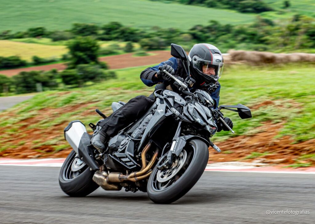 Este bloco entrega uma potência máxima de 136 cv a 9.000 rpm e torque de 11,5 kgf.m a 7.600 rpm. Para os puristas que olham apenas para os números frios, um aviso: embora declare alguns cavalos a menos que a antiga Z1000 de 2020, a mágica aqui está na entrega. O novo propulsor de quatro cilindros em linha agora entrega uma curva de torque muito mais cheia em baixas e médias rotações. Isso se traduz em respostas imediatas ao menor toque do acelerador, e caso você “torça totalmente o cabo”, aí você vai sentir toda a fúria da usina para fazer ultrapassagens nas rodovias com muita segurança.