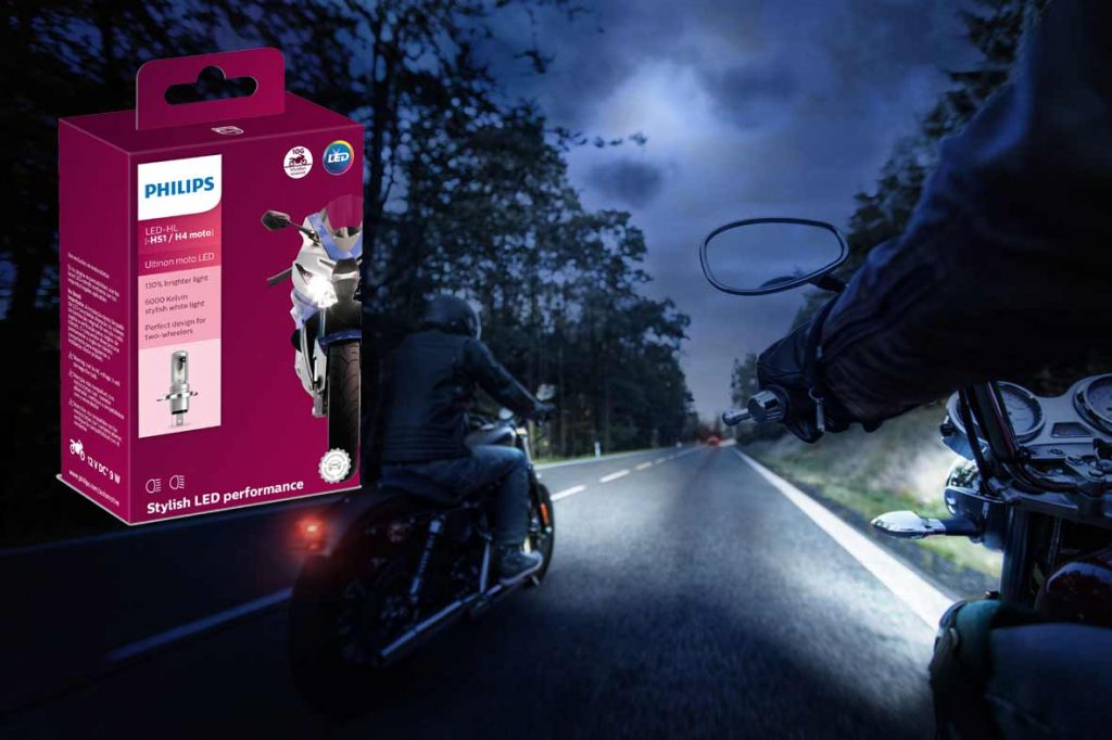 ão exigindo nenhuma modificação ou adaptação na moto que usa lâmpadas tipo HS1 ou H4, a Ultinon moto LED se destaca por proporcionar até 130% mais visibilidade quando comparada com as halógenas convencionais. É um ganho considerável em segurança na pilotagem. Traz luz branca, mais branca até que os faróis de xênon, dando uma aparência mais moderna para a moto equipada com ela. De acordo com a Philips, a nova lâmpada tem resistência às vibrações em até 10G, além disso, uma durabilidade de até 5 anos, graças a tecnologia desenvolvida para controlar a temperatura do sistema, batizada de ThermalCool. Para saber mais sobre a novidade, acesse www.lumileds.com