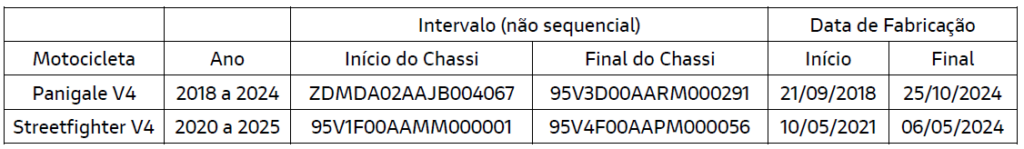 De acordo com a Ducati, o defeito pode aumentar o risco de acidentes, com possíveis danos materiais e físicos ao piloto, à garupa e a terceiros. Veja abaixo os chassis envolvidos nesta convocação da Ducati Brasil: