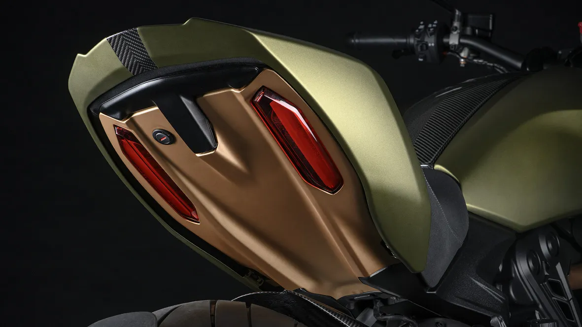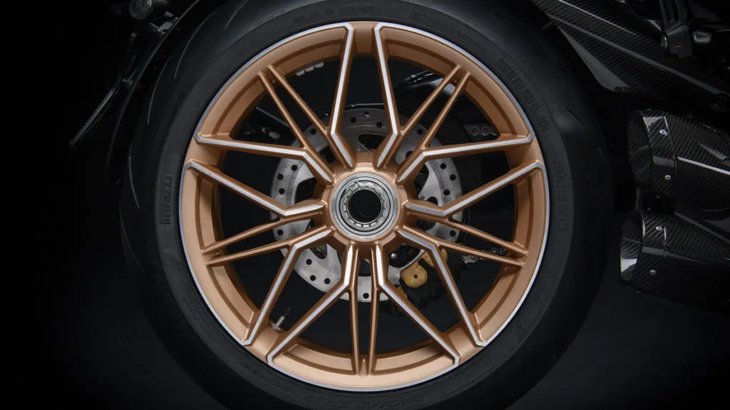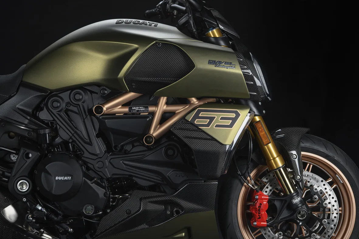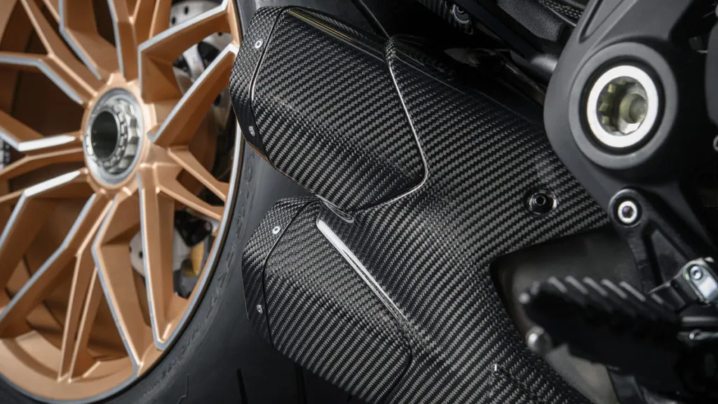 As rodas foram especialmente forjadas para a nova Ducati Diavel 1260 S Lamborghini, com desenho inspirado no carro, assim como as entradas de ar e tampas dos radiadores, feitas em fibra de carbono, assim como a tampa do silenciador, bico, proteção do assento, a estrutura do farol e os para-lamas dianteiro e traseiro.