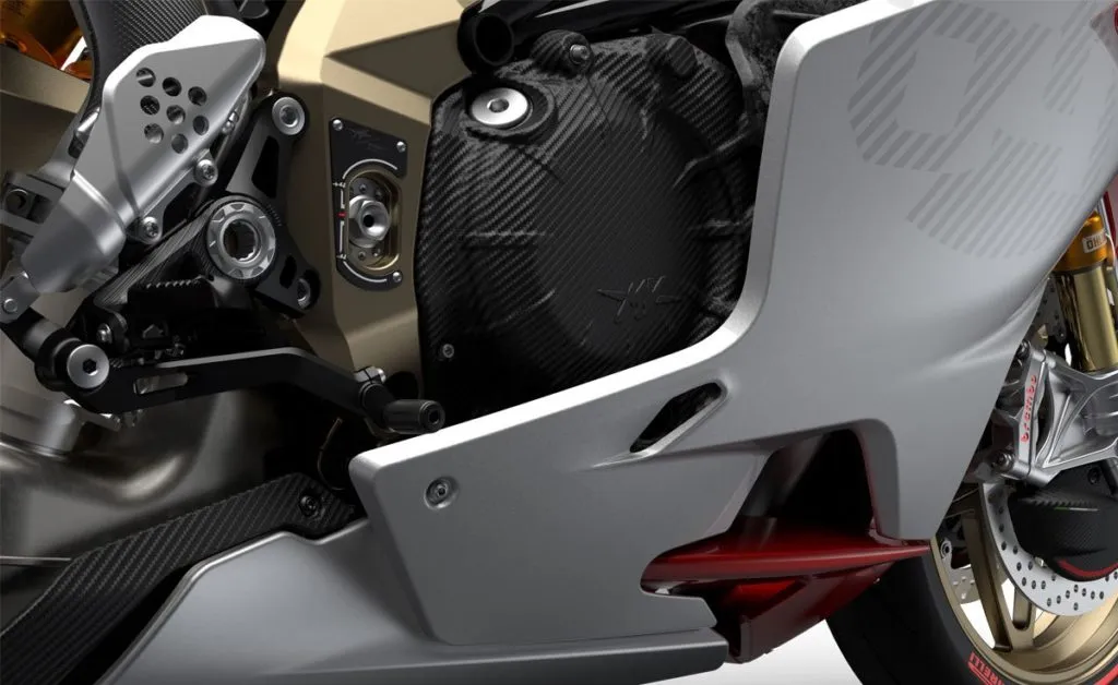 Com o aumento de desempenho induzido pelo novo motor, o fabricante transalpino também reformulou a aerodinâmica, colocando aletas na frente da carenagem. Além disso, todos os elementos dessa carenagem são feitos de fibras de carbono, com exceção do tanque, que foi construído em resina termoplástica.