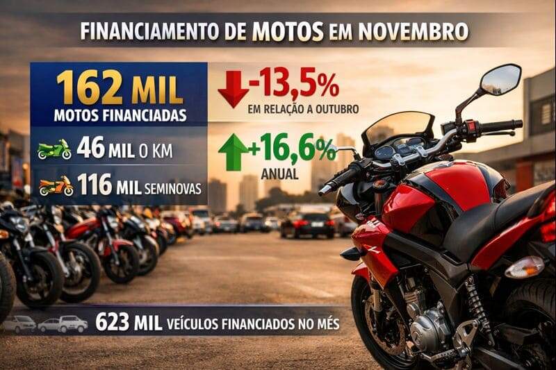 Na comparação anual, porém, o desempenho é positivo. Em novembro de 2024, o mercado havia registrado 139 mil motocicletas financiadas. O número atual indica crescimento de 16,6%, reforçando a retomada gradual do crédito para o segmento de duas rodas.