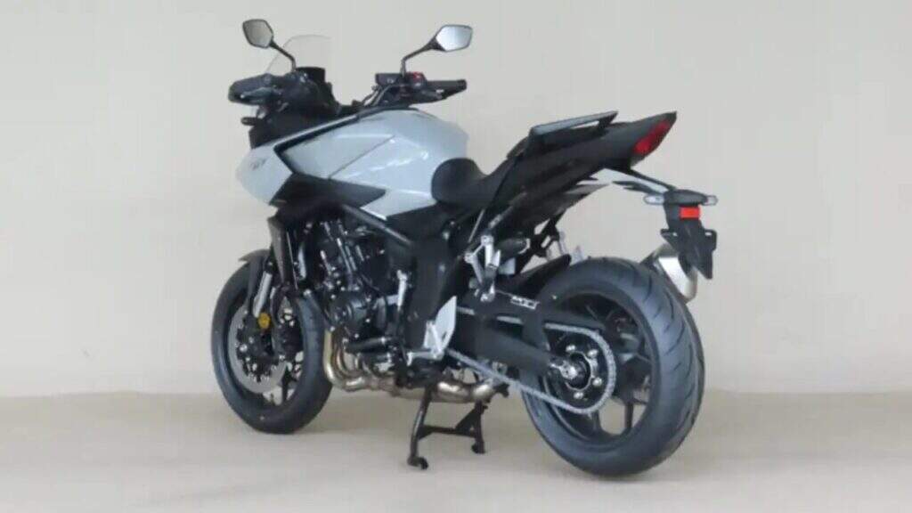 A Honda CB 1000 GT traz carenagem parcial que se estende a partir do tanque. As imagens mostram que a moto tem para-brisa alto, protetores de mão e assentos mais largos para piloto e garupa. O conjunto revela uma proposta de turismo esportivo elevado, com curso de suspensão ligeiramente maior (algo em torno de 150 mm) e rodas de alumínio fundido de 17 polegadas calçadas com pneus 120/70 na dianteira e 180/55 na traseira.