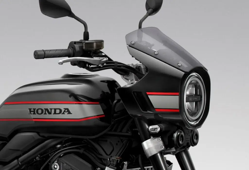 Visualmente, a Honda CB1000F aposta em linhas marcantes e referências claras às CBs dos anos 1980. O farol redondo com assinatura circular, os escapes cromados e as buzinas duplas reforçam o apelo nostálgico. A ergonomia, por outro lado, privilegia o conforto, com posição de pilotagem ereta, assento de 795 mm de altura e peso total de 214 kg.