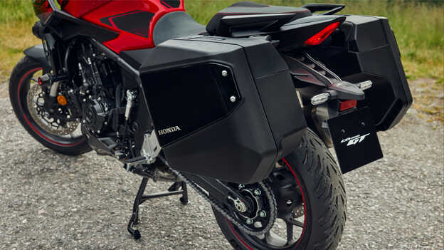 Com visual desenvolvido pelos estúdios da Honda na Itália e no Japão, a CB1000GT combina linhas agressivas e carenagem para oferecer estabilidade em qualquer condição de pilotagem. O para-brisa elétrico ajustável em cinco posições garante boa proteção aerodinâmica, e as malas laterais de série reforçam seu estilo touring. O assento foi redesenhado, com altura de 825 mm e mais espessura para condutor e garupa.