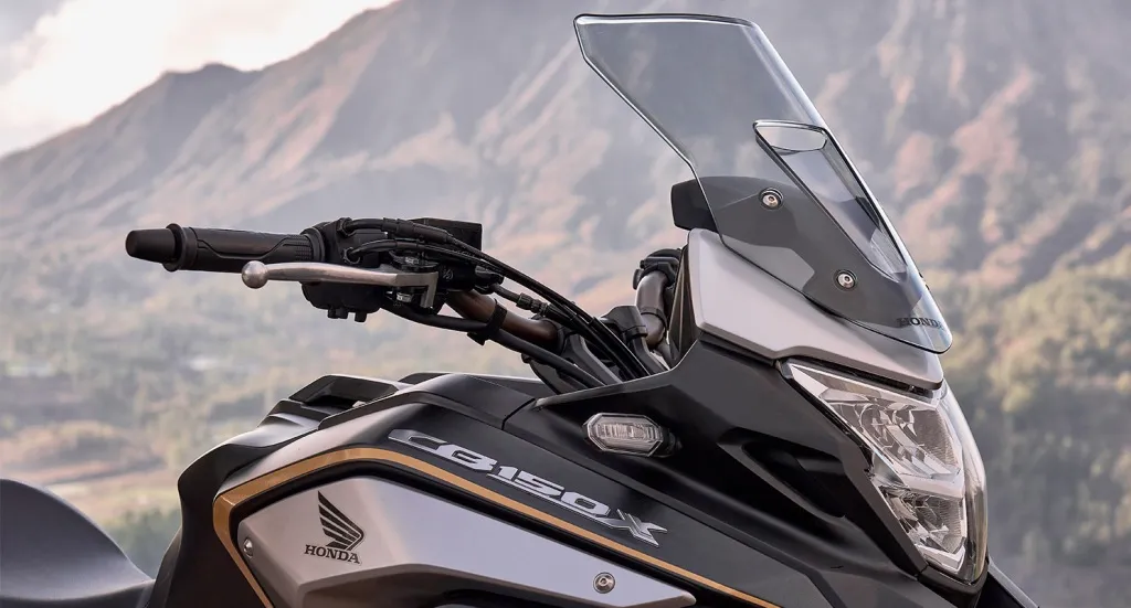 Assim como a CB200X, a nova CB150X recebe itens de estilo que a deixam com aparência de uma moto aventureira de maior porte, como painel frontal que remete as irmãs maiores, para-brisa e tanque de combustível com linhas afiadas que seguem até as carenagens laterais.