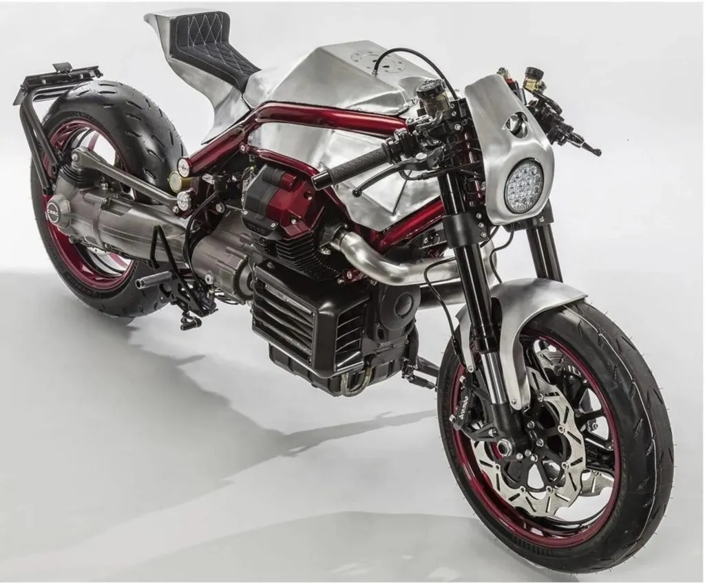 Kenji pintou o quadro e as rodas em um tom de vinho. Entre os destaques estão o garfo invertido da Griso 1200, totalmente ajustável, as pinças Brembo com rotores Pro Brake e os pneus Michelin Power GP. Há também um painel Motogadget e faróis duplos empilhados, adicionando mais possibilidades ao design. Já as luzes traseiras e os indicadores de direção foram movidos para o suporte da placa.
