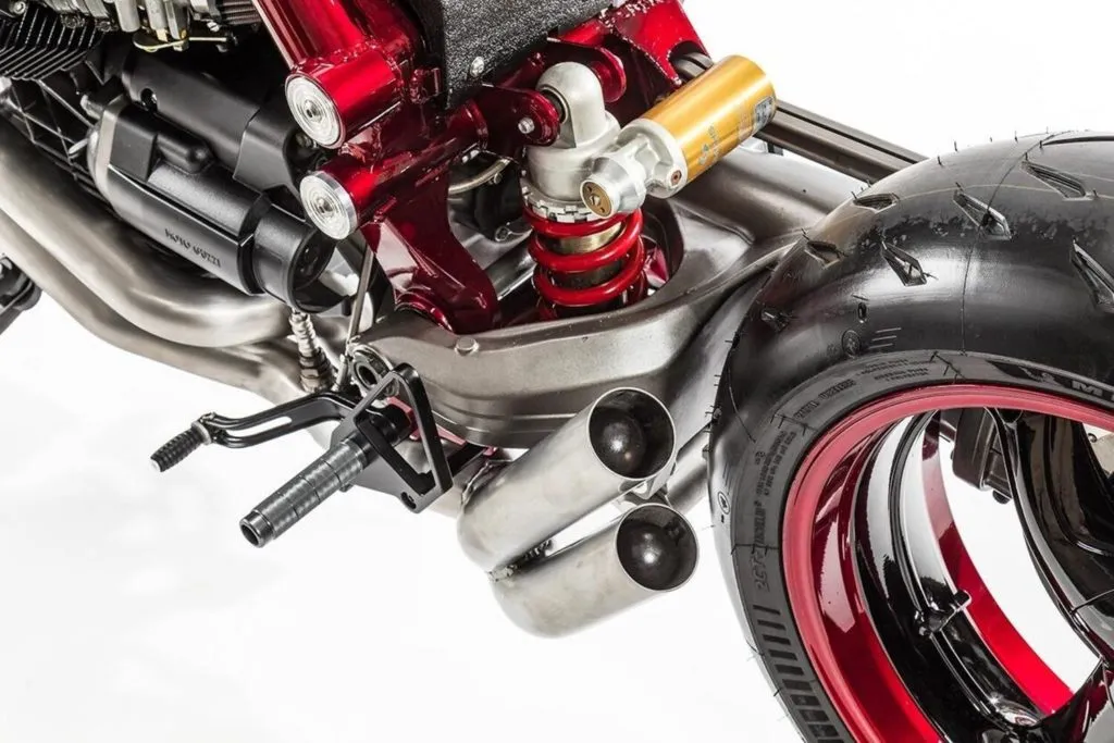 Inicialmente, a oficina não tinha a intenção de mexer nos componentes internos do motor. Em vez disso, a melhor maneira de ganhar velocidade foi reduzir o peso seco para 229 kg. Além disso, há um sistema de escape de aço inoxidável personalizado ao redor do lado esquerdo, deixando o V-twin e a transmissão do eixo totalmente expostos à direita.