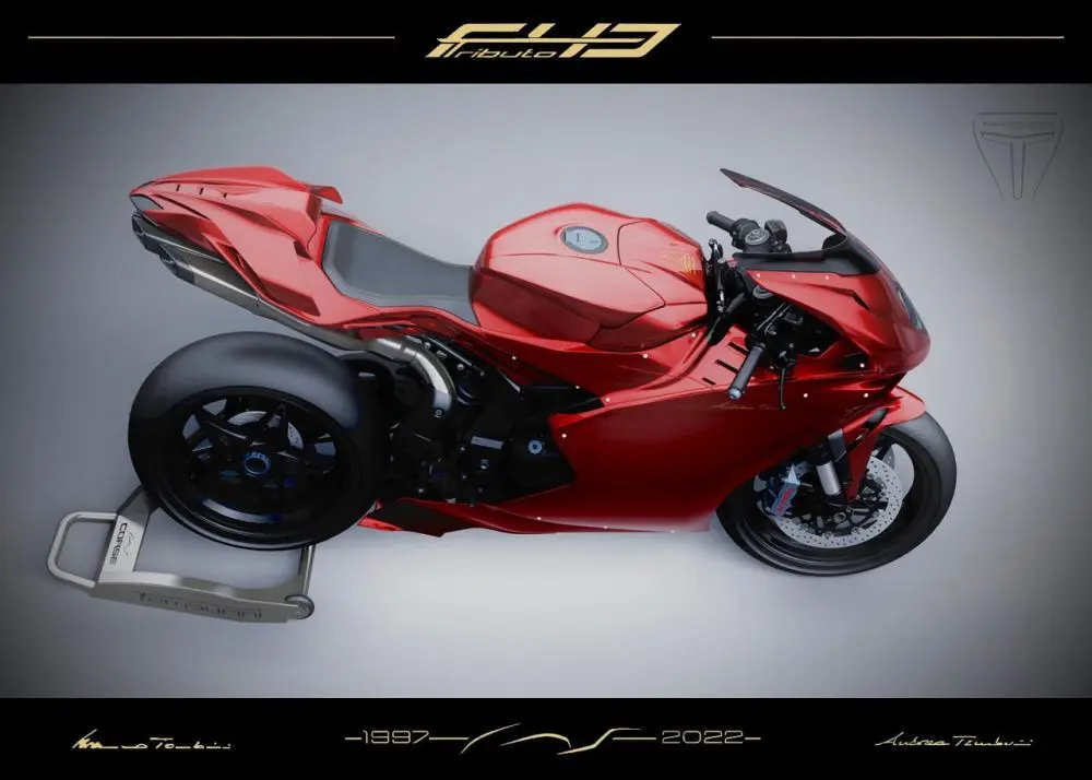 O designer Andrea Tamburini resolveu homenagear o seu pai, Massimo Tamburini, criando os traços da F43 Tributo como um presente póstumo. Trata-se de uma reinterpretação mais moderna da MV Agusta F4. Andrea também é autor dos projetos da Ducati 916 e MV Agusta Brutale, entre outras belas motos.