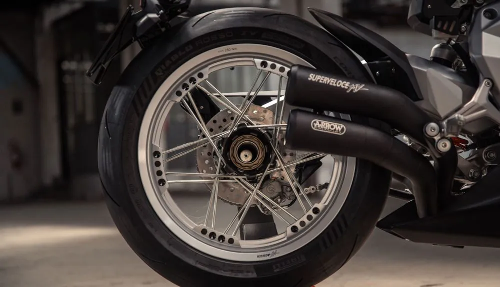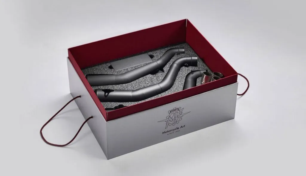 Além da moto em si, está incluída uma caixa bordô que contém a tampa traseira, a capa criada especificamente para esta máquina, o referido certificado de autenticidade e duas peças muito especiais, um escapamento de saída tripla Arrow, para uso exclusivo no circuito, e a unidade de controle eletrônico com a qual funciona o escapamento especial e que permite extrair a potência máxima do motor de três cilindros de 798 cm³.