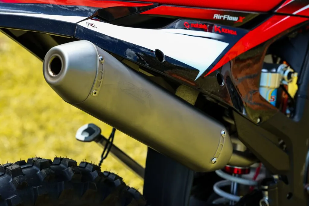 Com apenas 106 kg em ordem de marcha, tanque de 8 litros, altura do solo de 350 mm e entre-eixos de 1.500 mm, a nova Racing equilibra leveza e robustez como poucas na categoria. O escapamento MXF Pro-Exhaust Titanium, com curva em aço inox, contribui para redução de peso e melhor desempenho.