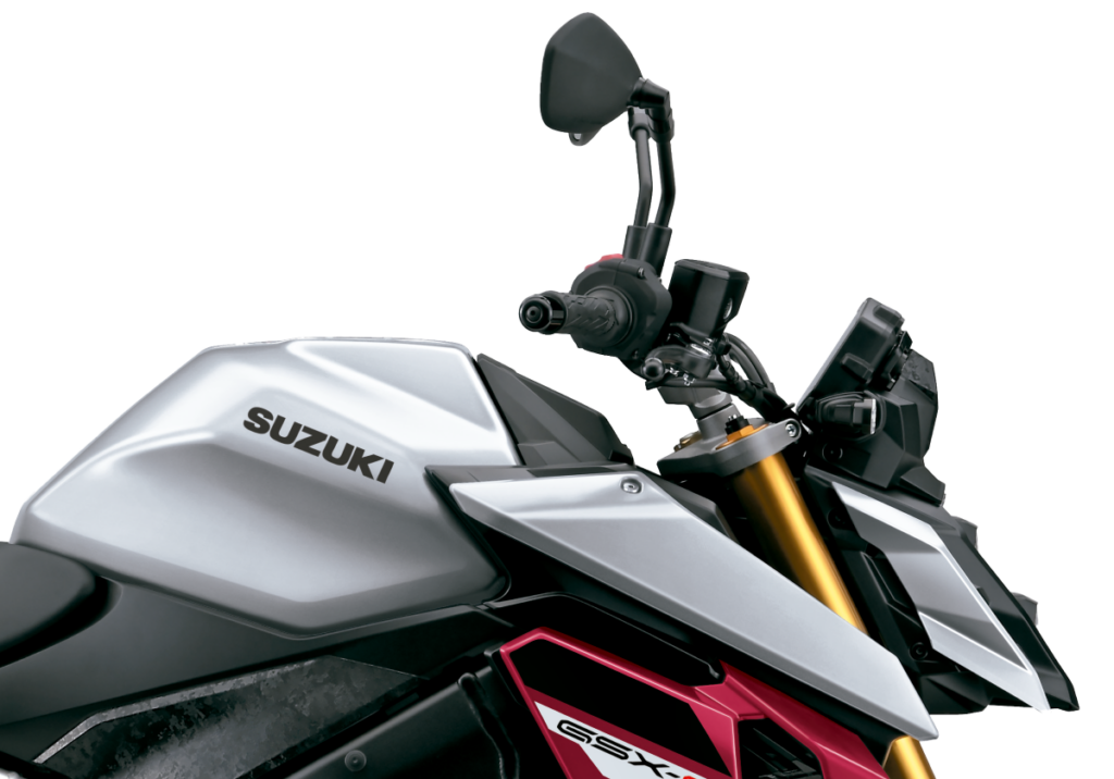 Nesse sentido, a GSX-S1000 2025 pode ser encomendada nas pinturas Metallic Triton Blue (azul metálico com detalhes em branco), Metallic Mat Sword Silver (cinza fosco com vermelho) e Glass Sparkle Black (preta). Todas elas continuam com os garfos dianteiros tingidos de dourado.