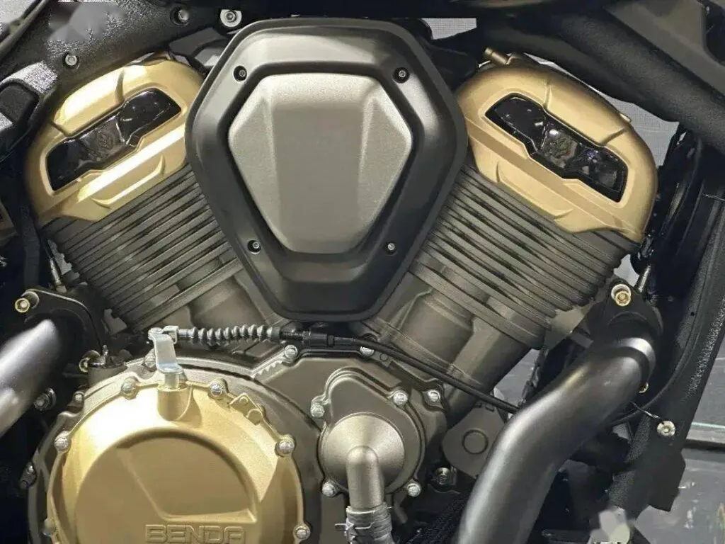 Já no que diz respeito ao motor, a Benda Napoleon 450 é empurrada por um V-Twin de dois cilindros com 448 cm³ e refrigeração líquida, usina capaz de entregar 50 cv de potência a 8.850 rpm e torque na faixa dos 5 kgf.m e que atua em conjunto com um escape duplo. A marca declara que ela usa embreagem deslizante, mas não informa quantas velocidades possui o câmbio.