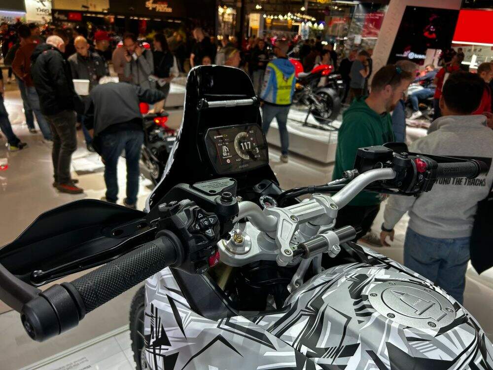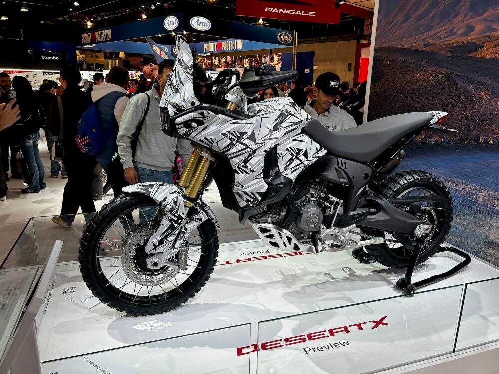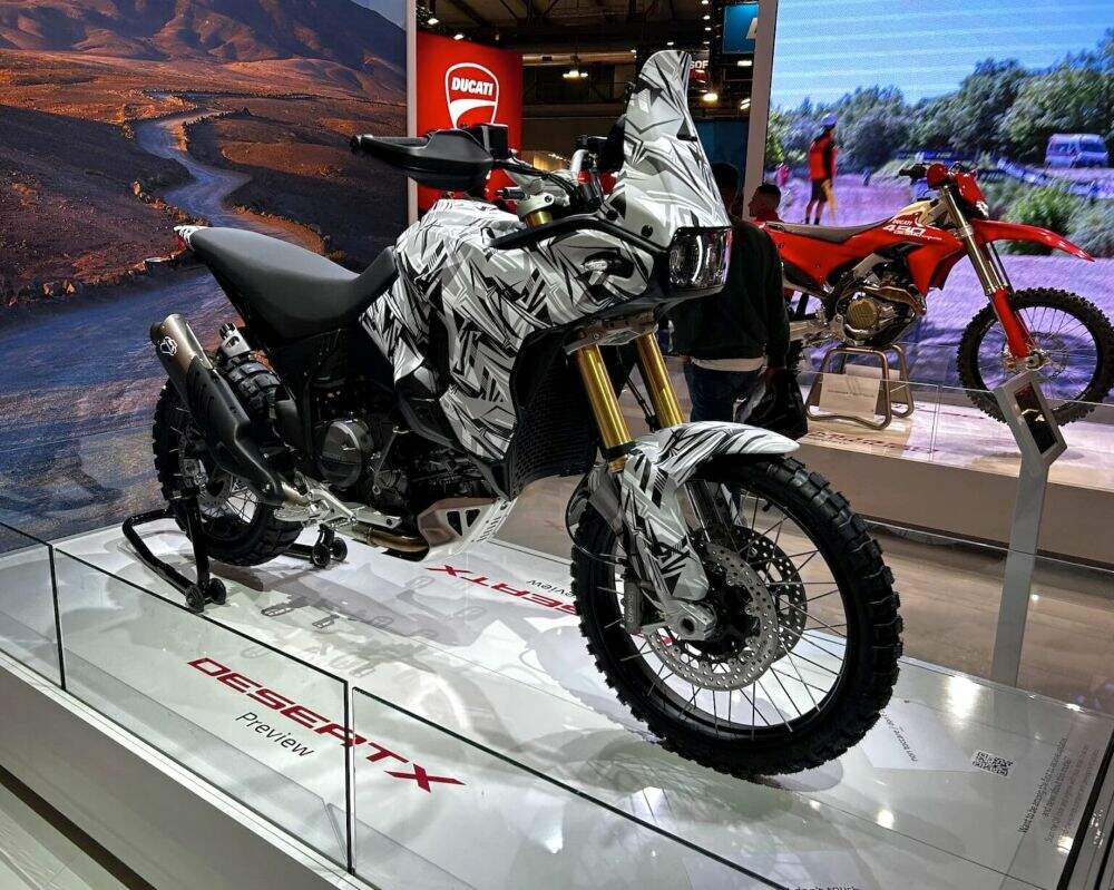 Exibida na feira de Milão com pintura camuflada e sem paleta de cores definitiva, a nova DesertX tem visual mais enxuto e ar de protótipo funcional. Em suma, ela revela a direção que a Ducati pretende seguir para o futuro de suas maxi enduros.