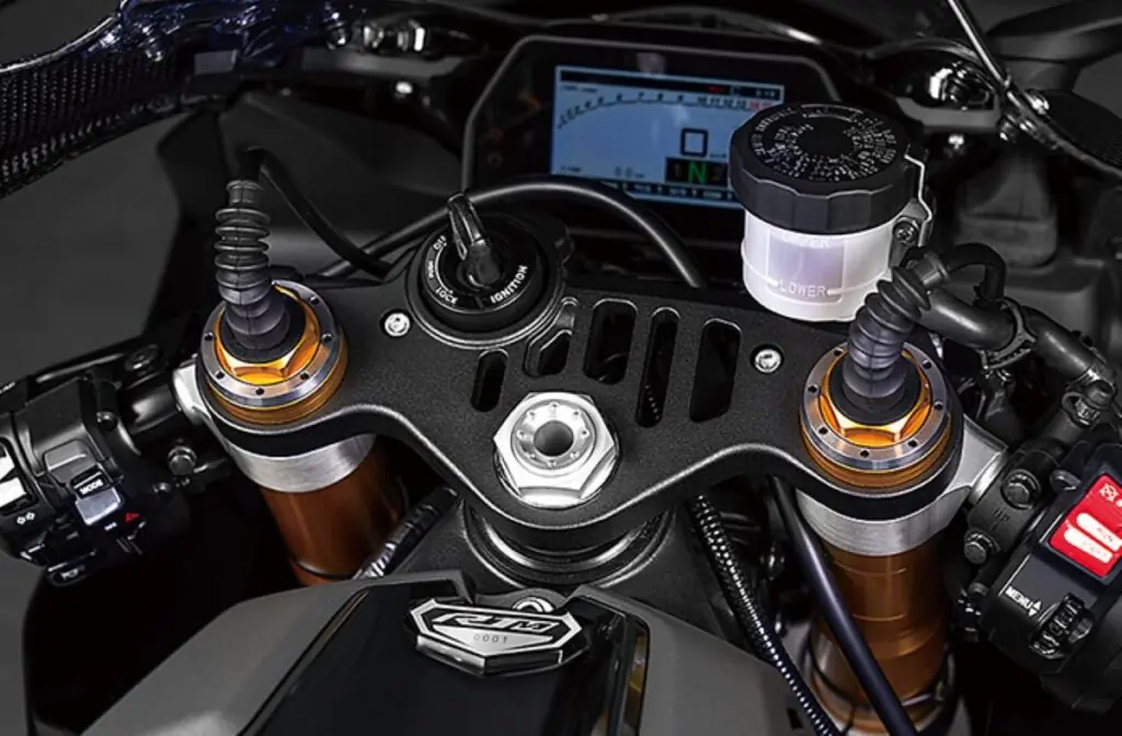 Para quem exige o máximo, a versão R1M traz a Suspensão Eletrônica de Corrida da ÖHLINS (ERS). O sistema utiliza um cilindro de gás pressurizado a 0,6 MPa no suporte do eixo dianteiro para reduzir a cavitação do óleo, entregando um amortecimento estável mesmo sob cargas extremas de pista.