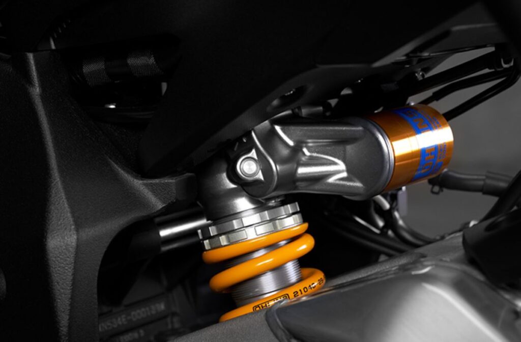 Para quem exige o máximo, a versão R1M traz a Suspensão Eletrônica de Corrida da ÖHLINS (ERS). O sistema utiliza um cilindro de gás pressurizado a 0,6 MPa no suporte do eixo dianteiro para reduzir a cavitação do óleo, entregando um amortecimento estável mesmo sob cargas extremas de pista.