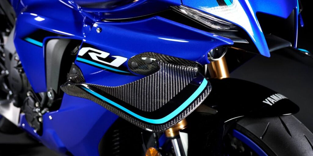 A silhueta da R1 2026 agora conta com Winglets em fibra de carbono. Herdadas diretamente das pistas, essas “asas” geram downforce que mantém a roda dianteira grudada no asfalto em acelerações brutais e melhora a estabilidade em frenagens e curvas.