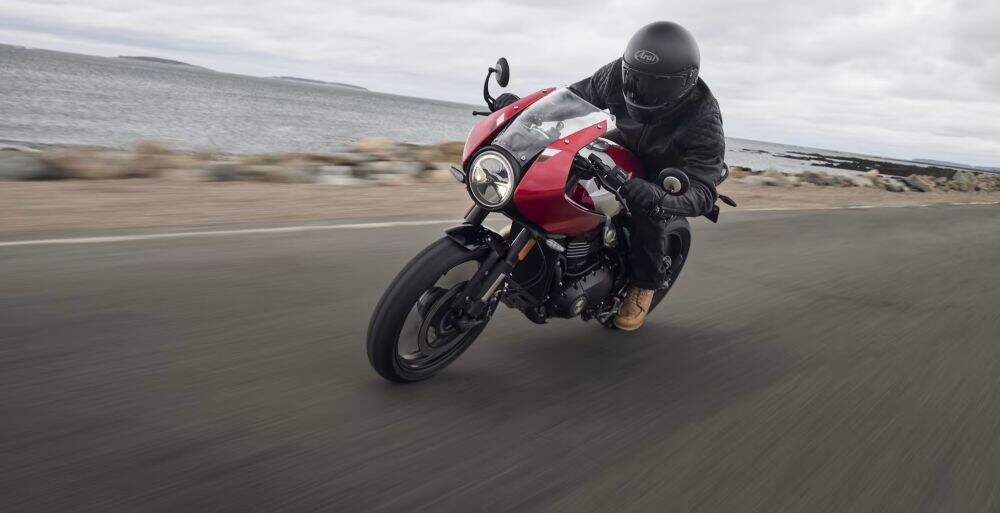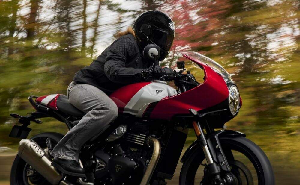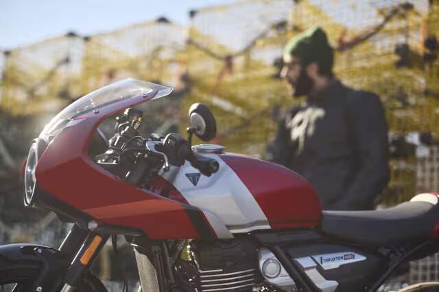 Visualmente, o modelo se destaca pela carenagem frontal que abriga o farol redondo de LED, pelo guidão clip-on, além das pedaleiras recuadas e da rabeta que remete às café racers clássicas. O tanque esculpido traz o tradicional emblema triangular da Triumph, enquanto o escapamento elevado e a traseira minimalista completam o conjunto.