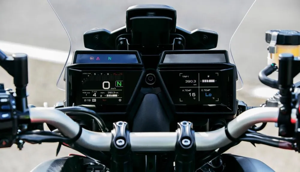 A instrumentação é dividida em dois paineis TFT multifuncionais de 3,5 polegadas. Na tela esquerda há o contagiros com barra multicolorida, velocímetro digital, medidor de combustível, posição de marcha e indicador de modo TCS. A tela direita é dividida em quatro seções separadas, mostrando uma gama de informações como hodômetros total e parciais, temperatura, hora, etc.