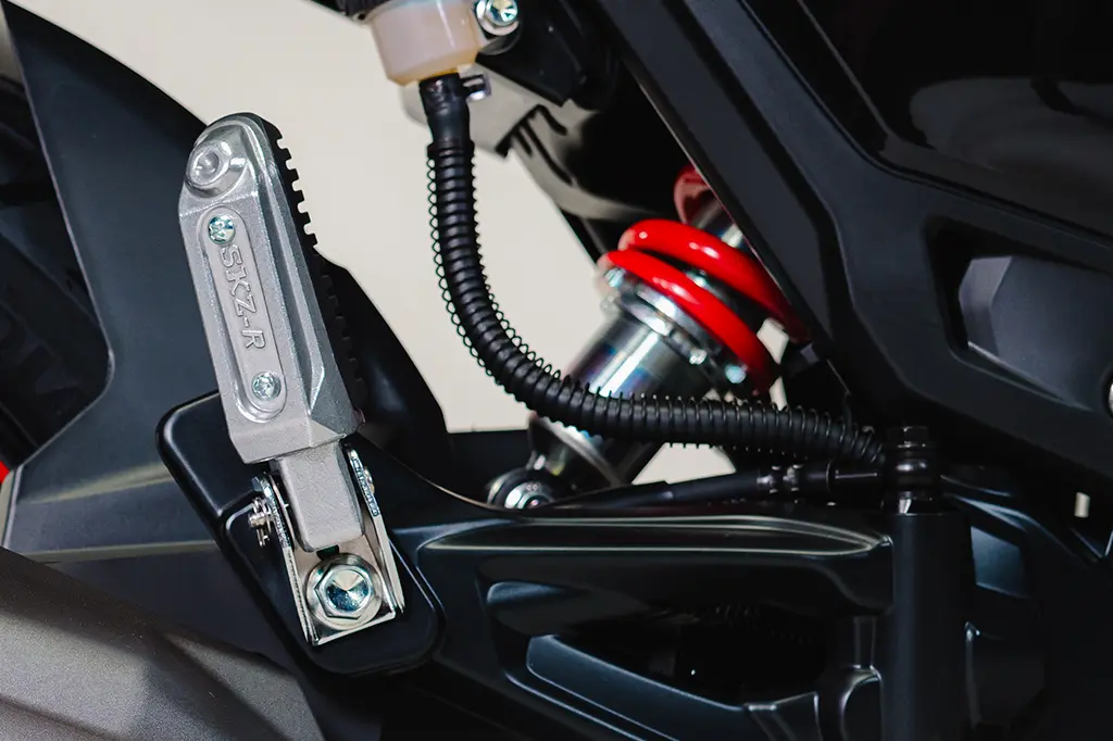 A nova 150 da SBM utiliza chassi em aço tipo Diamond, combinando resistência e leveza. A suspensão dianteira convencional oferece curso de 107 mm, enquanto a traseira traz monoamortecedor. O sistema de freios a disco possui 260 mm na dianteira e 190 mm na traseira, com ABS de canal único atuando na roda dianteira.