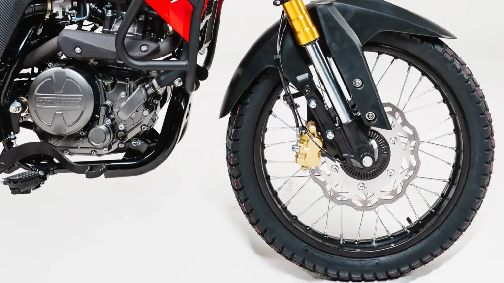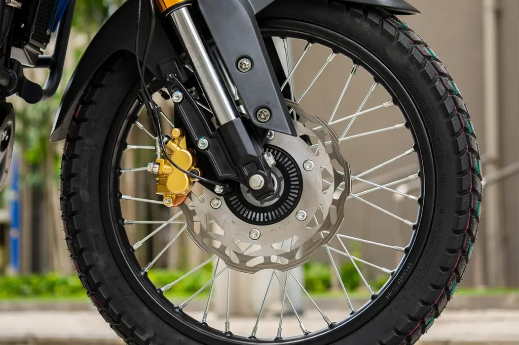 A ciclística também acompanha a proposta aventureira. Na dianteira, o modelo conta com garfo telescópico invertido, enquanto a traseira adota sistema monoamortecido (monoshock). O resultado é uma pilotagem mais firme e estável, tanto no asfalto quanto na terra.