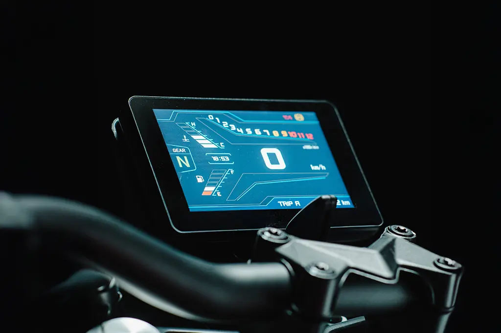Entre os itens de série, a SBM 400s traz iluminação full-LED, painel TFT digital, tomada USB, banco bipartido, cavalete central, sensor de inclinação e sensor de cavalete lateral.