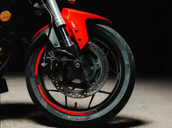 Os freios são a disco nas duas rodas, com 300 mm na dianteira e 240 mm na traseira, ambos com ABS de duplo canal. As rodas de liga leve de 17 polegadas utilizam pneus nas medidas 110/70 na dianteira e 150/60 na traseira.