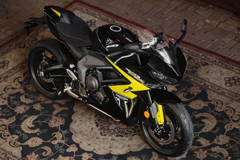 A nova Triumph Daytona Cup 660 Limited Edition recebe pintura preta metálica combinada com grafismos na cor Triumph Yellow Performance. O modelo também traz assento monoposto e banco em alcântara, com costuras no mesmo tom amarelo da Triumph.