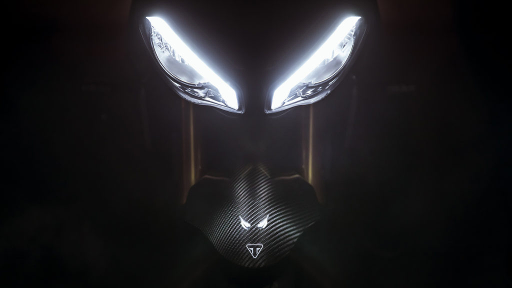 Já neste teaser divulgado no Twitter, a Triumph mostra uma silhueta de uma lanterna traseira ao lado dos faróis dianteiros da moto, e reforça o convite para a apresentação de sua nova motocicleta.