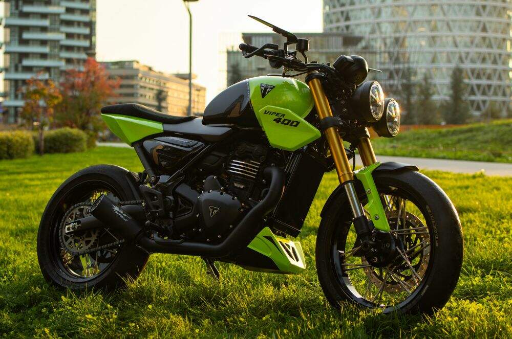 Criada como homenagem aos 30 anos da icônica Triumph Speed Triple, a Viper 400 carrega detalhes que celebram esse legado. Farol duplo, perfil compacto e musculoso, rabeta curta e a pintura exclusiva “Roulette Green” resgatam o espírito ousado da naked britânica que marcou uma geração.