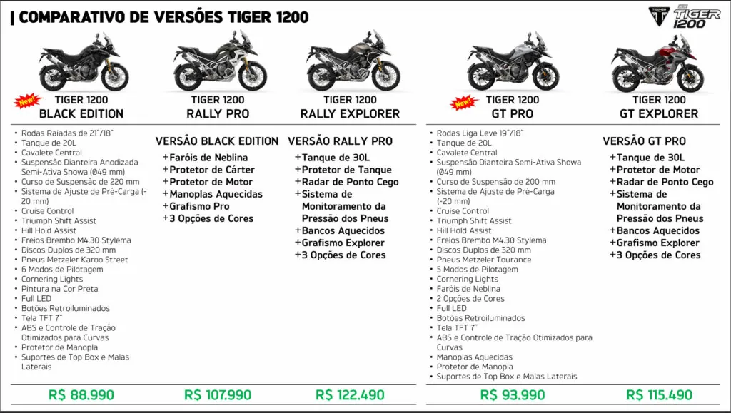 Apenas para o Brasil chega uma exclusiva versão Rally Black Edition, que tem o preço mais em conta de toda a família. A Tiger 1200 custa a partir de R$88.990 na versão Black Edition, R$ 93.990 a GT Pro, R$ 107.990 a Rally Pro, R$ 115.490 a GT Explorer e R$ 122.490 a Rally Explorer.