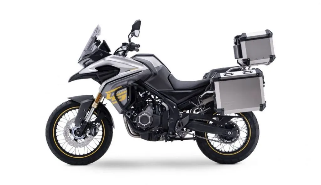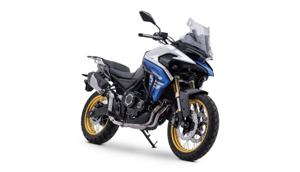 Quanto ao sistema de frenagem, a máquina conta com um conjunto de discos duplos dianteiros de 298 mm e um disco traseiro de 240 mm, equipados com pinças Nissin com ABS com três níveis de intervenção.