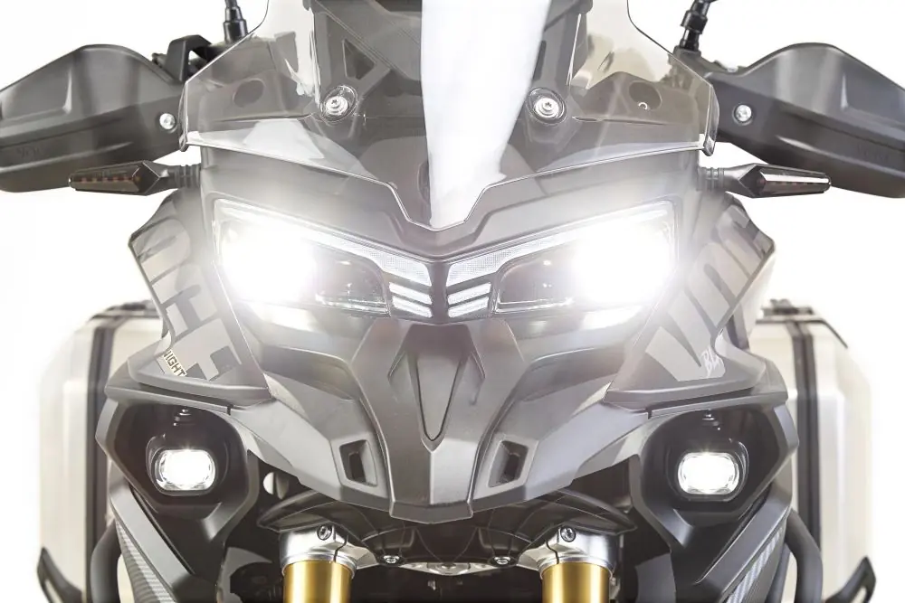 A lista de equipamentos premium chama atenção, com painel LCD colorido de 7 polegadas com conectividade e navegação turn-by-turn. Também há câmera frontal, iluminação full LED, rodas raiadas de 19 polegadas na dianteira e 17 na traseira, reforçando sua vocação para cidade, estrada e off-road leve.