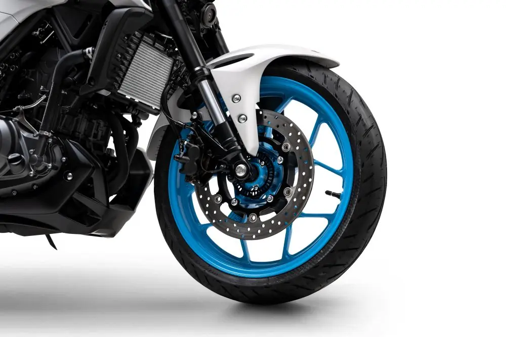 A suspensão dianteira traz garfo invertido com 37 mm de diâmetro e 130 mm de curso, enquanto a traseira é monoshock e em sete níveis de regulagem de pré-carga. A MT-03 Connected está equipada com freios ABS nas duas rodas, com disco dianteiro de 298 mm e disco traseiro de 220 mm. Já os pneus têm as medidas 110/70 na frente e 140/70 atrás. As rodas são de liga leve e tem 17 polegadas.