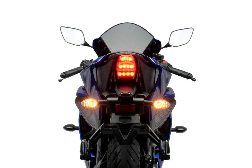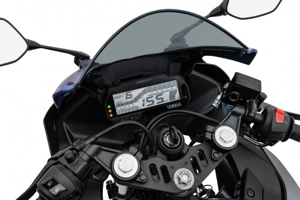 A R15 ABS 2026 vem com farol, luz de posição e lanterna traseira em LED, além de lampejador de farol. O painel 100% digital com fundo branco exibe conta-giros, indicador de marcha, medidor de combustível, indicador VVA, Shift Light ajustável e diversas informações de viagem, como consumo médio e instantâneo, velocidade média, hodômetros e Fuel Trip.