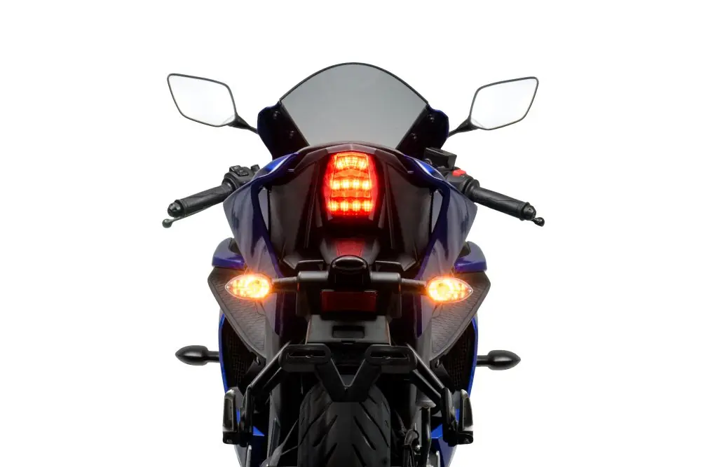 O design segue o DNA R-Series, com carenagens em camadas desenvolvidas em túnel de vento para otimizar o fluxo de ar e reduzir turbulência na área do capacete. O modelo conta ainda com quadro Deltabox, balança de alumínio e conjunto visual inspirado nas motos de competição, mantendo a proposta de unir esportividade com uso diário.