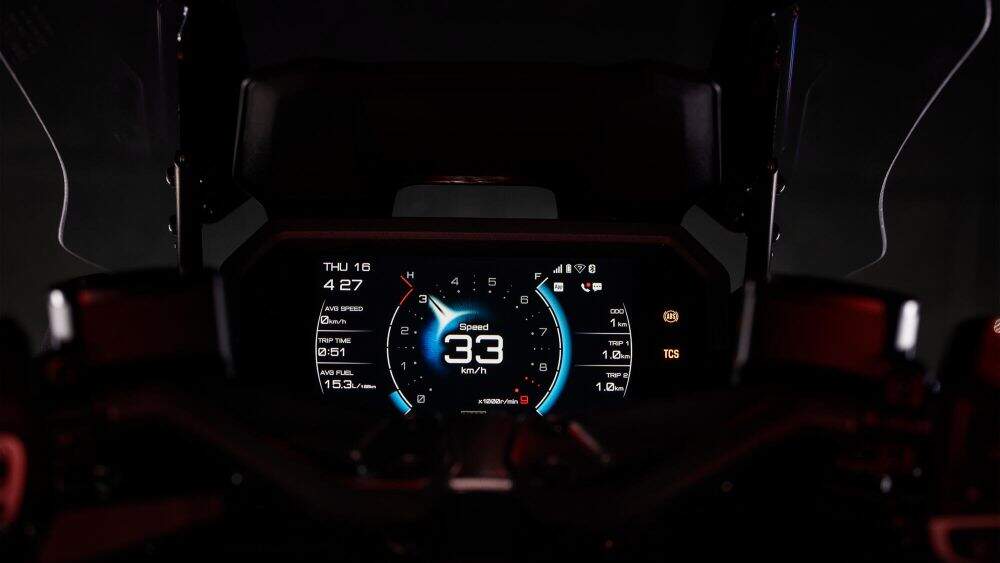 O pacote tecnológico inclui painel TFT de 7 polegadas com três modos de exibição, integração com o aplicativo Yamaha MyRide. Também há compatibilidade com o Garmin Motorize para navegação completa, incluindo trânsito, clima e pontos de interesse.