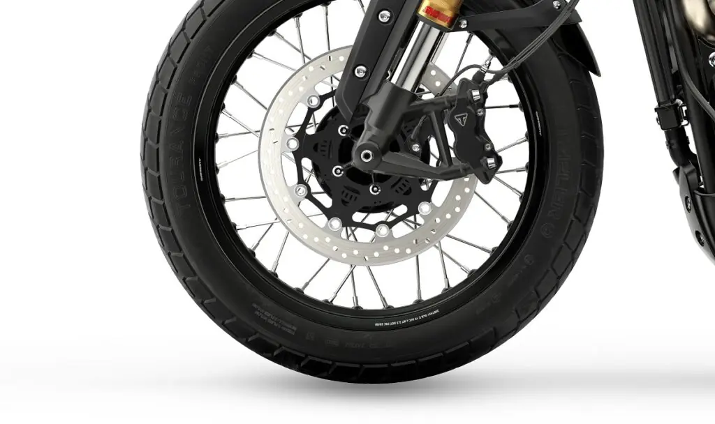Apesar de seu estilo clássico, a Triumph Scrambler 900 tem uma pegada aventureira, imagem imposta principalmente pelas rodas raiadas de 19 polegadas na dianteira e 17 atrás, vestidas de pneus de uso misto.