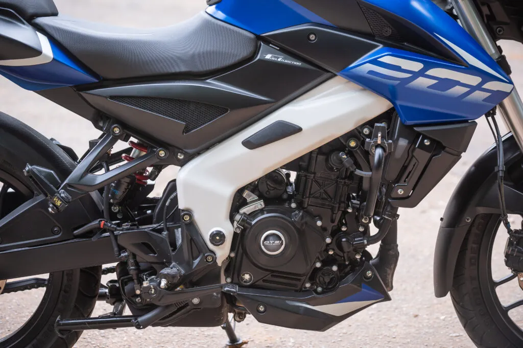 O motor da Dominar 200 tem 199,5 cm³ de capacidade volumétrica e conta com a inovadora tecnologia DST-i que utiliza três velas de ignição para aproveitar toda a mistura na combustão e melhorar seu desempenho. Esse motor é capaz de gerar 24 cv de potência máxima 9.750 rpm e 1,9 kgf.m de torque a 8.000 rpm, números que a colocam na vanguarda da cilindrada. Só para comparação, a Fazer FZ25 da Yamaha gera 21,3 cv e a nova Honda CB 300F Twister é capaz de produzir 24,7 cv. Já a Bajaj perde um pouco no torque, menor que o das concorrentes brasileiras, com 2,1 e 2,61 kgf.m para Yamaha e Honda respectivamente. O câmbio de seis marchas é bem escalonado e aproveita muito bem a entrega do motor.