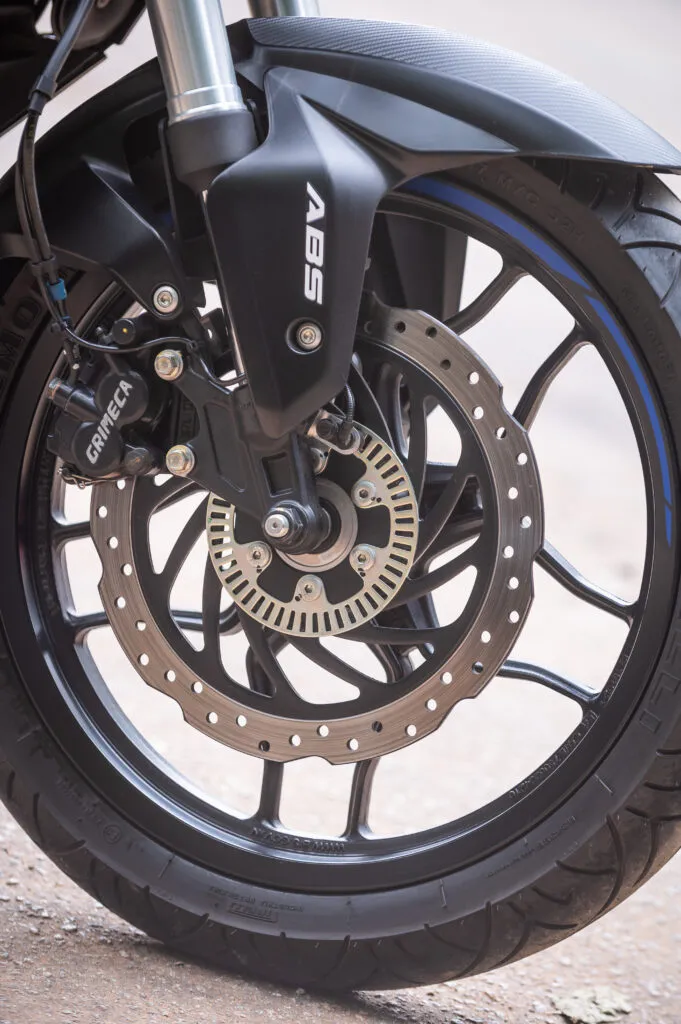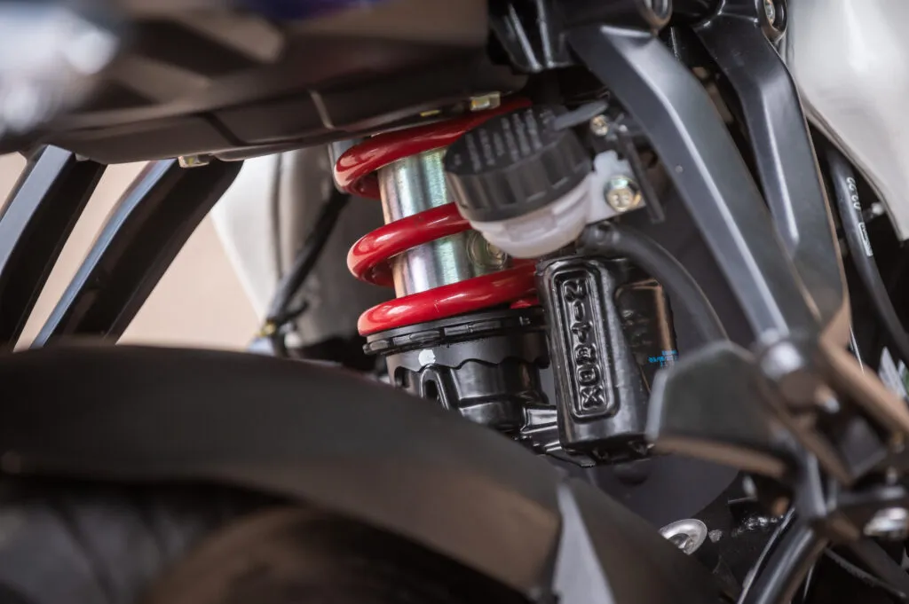 O conjunto ciclístico da Dominar 200 também foi bem acertado com a escolha da suspensão dianteira com bengalas invertidas de 33 mm de diâmetro e o monoamortecedor traseiro com reservatório de gás montados no chassi perimetral de dupla vida, proporcionando um conjunto bastante equilibrado e preciso.